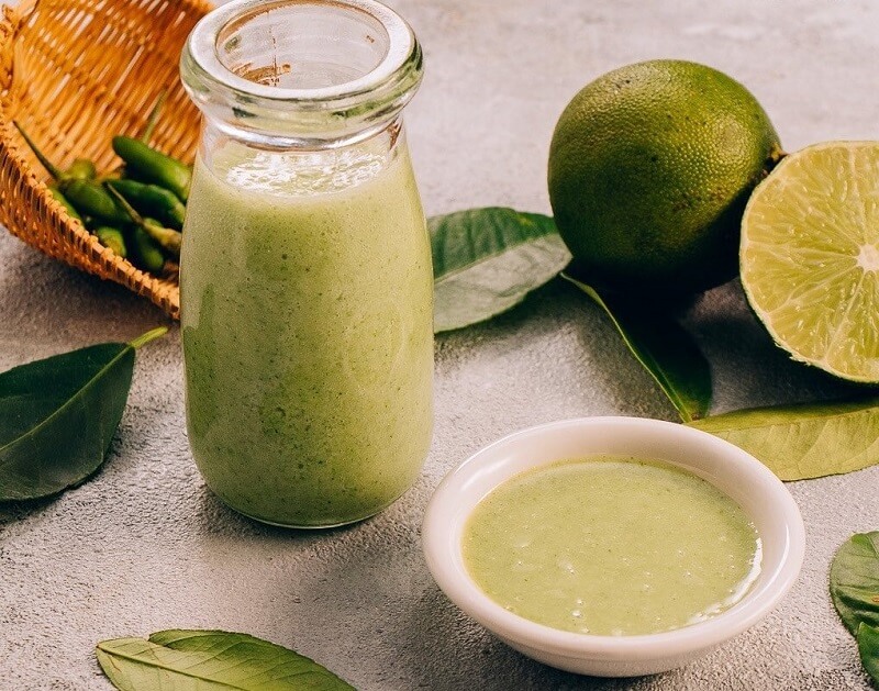 Cho vào máy xay sinh tố 3 muỗng cà phê muối, 3 muỗng cà phê đường, ½ muỗng cà phê bột ngọt, lá chanh cắt nhỏ, ớt, wasabi, nước cốt chanh của 1 quả chanh. Xay nhuyễn và đều các nguyên liệu là bạn đã hoàn thành nước chấm chua cay để ăn ăn kèm lẩu.