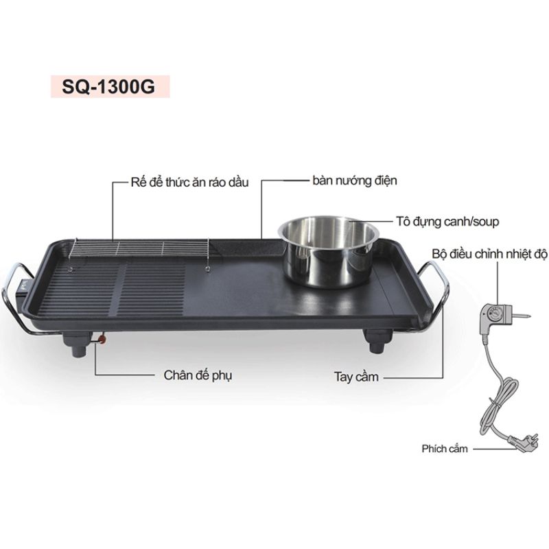 Bàn nướng điện Tiger Queen SQ-1300G nhập khẩu từ Hàn Quốc có thiết kế nhỏ gọn, sang trọng, hiện đại và an toàn luôn luôn có mặt trong mọi không gian nhà bếp. Bên cạnh đó, với cấu tạo từ linh kiện cao cấp, không chứa chất độc hại và chịu nhiệt tốt giữ bàn nướng điện lâu phai màu với độ bền cao theo thời gian sử dụng. Đồng thời, bàn nướng điện Tiger Queen có tích hợp tô đựng canh/soup và rế làm ráo dầu kèm theo sản phẩm tiện lợi cho việc nấu nướng.