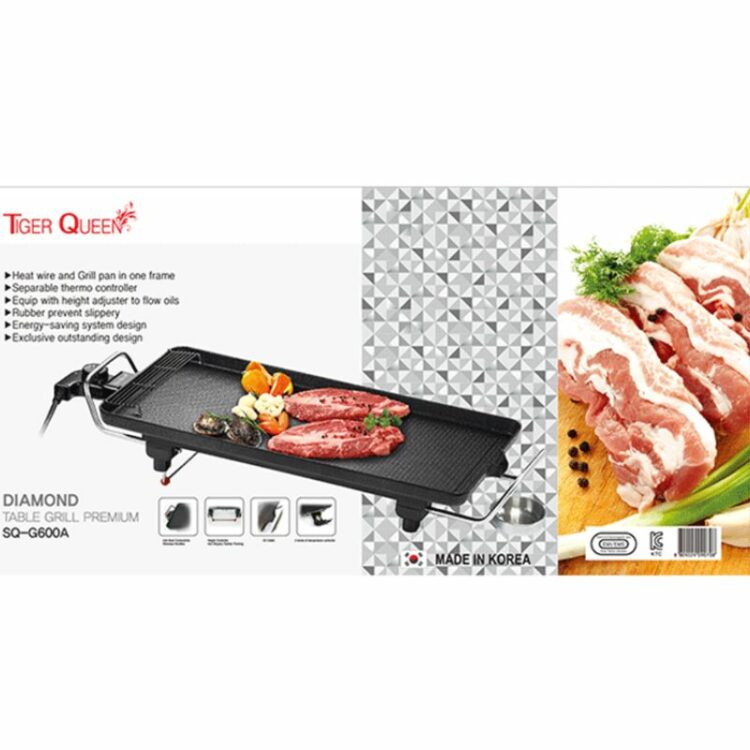 Nhằm đáp ứng sở thích ăn các món nướng mà không chứa nhiều dầu mỡ và an toàn cho người sử dụng thì Thương Hiệu Tiger Queen đến từ Hàn Quốc chuyên sản xuất các sản phẩm nhà bếp, gia dụng nói chung đã cho ra đời những mẫu Bàn nướng điện hiệu Tiger Queen cao cấp tại thị trường Việt Nam. Bàn nướng điện Tiger Queen SQ-G600A được sản xuất từ linh kiện cao cấp có độ bền cao và không chứa chất độc hại, thiết kế nhỏ gọn, sang trọng, hiện đại và an toàn luôn luôn có mặt trong mọi không gian nhà bếp. Hơn thế nữa, với công nghê phủ lớp Titanium cùng cấu trúc 3 lớp kim cương “Triple Diamond” dầy 4mm chỉ có ở Hàn Quốc cho bề mặt bàn nướng khả năng chịu nhiệt cao, chống trầy xước, chống dính và thức ăn chín đều nhanh mà không bị khét, không tạo khói và không cần sử dụng nhiều dầu mỡ trong quá trình nướng là một sự lựa chọn lí tưởng giúp bạn chế biến và thưởng thức những món nướng yêu thích cho gia đình ngay tại bàn ăn mà vẫn giữ nguyên hương vị.