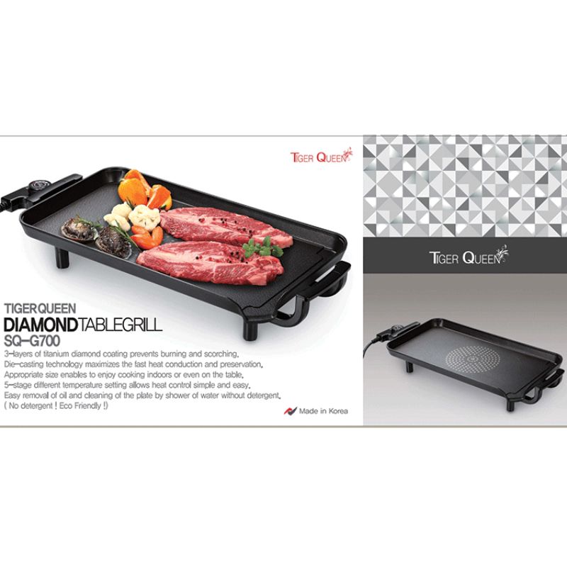Nhằm đáp ứng sở thích ăn các món nướng mà không chứa nhiều dầu mỡ và an toàn cho người sử dụng thì Thương Hiệu Tiger Queen đến từ Hàn Quốc chuyên sản xuất các sản phẩm nhà bếp, gia dụng nói chung đã cho ra đời những mẫu Bàn nướng điện hiệu Tiger Queen cao cấp tại thị trường Việt Nam. Bàn nướng điện Tiger Queen SQ-G700 được sản xuất từ linh kiện cao cấp có độ bền cao và không chứa chất độc hại, thiết kế nhỏ gọn, sang trọng, hiện đại và an toàn luôn luôn có mặt trong mọi không gian nhà bếp. Hơn thế nữa, với toàn bộ cấu trúc nhôm tinh khiết nguyên khối phủ 3 lớp kim cương “Triple Diamond” dầy 4mm chỉ có ở Hàn Quốc cho bề mặt bàn nướng khả năng chịu nhiệt cao, chống trầy xước, chống dính và thức ăn chín đều nhanh mà không bị khét, không tạo khói và không cần sử dụng nhiều dầu mỡ trong quá trình nướng là một sự lựa chọn lí tưởng giúp bạn chế biến và thưởng thức những món nướng yêu thích cho gia đình ngay tại bàn ăn mà vẫn giữ nguyên hương vị.