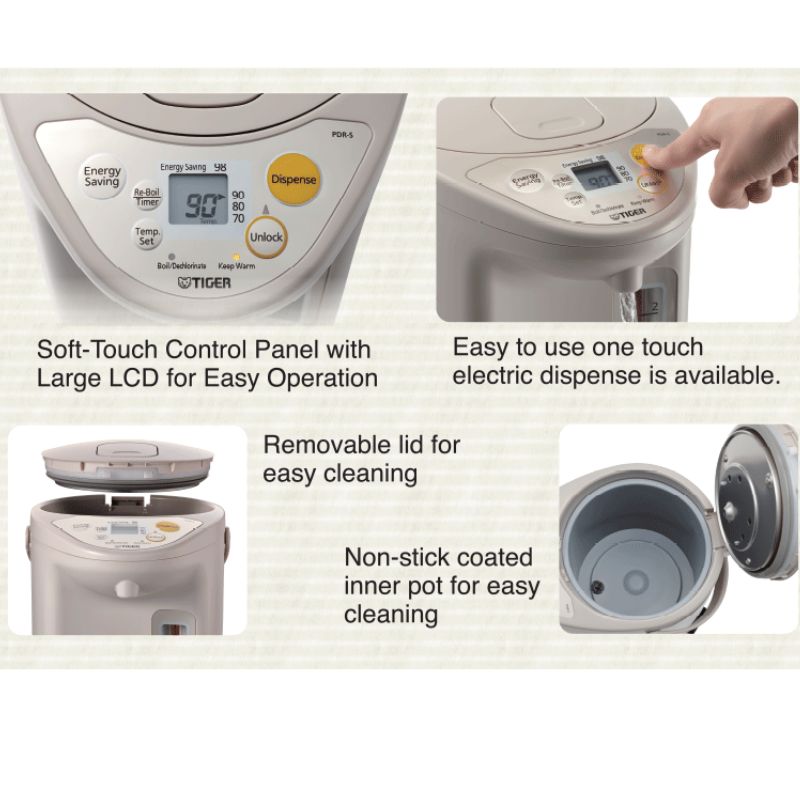 Bình thủy điện tử cao cấp Tiger PDR-S40W với thiết kế bảng điều khiển điện tử kèm màn hình LCD hiện đại dễ dàng sử dụng tích hợp nhiều tính năng tiện lợi cho bạn như chức năng nấu sôi lại và chức năng nấu khử mùi Clo trong nước đảm bảo sức khỏe cho cả gia đình bạn. Hơn thế nữa, Tiger cũng tích hợp 4 chế độ cài đặt nhiệt độ giữ ấm “98ºC, 90ºC, 80ºC & 70ºC“ phù hợp với từng loại nước uống để pha chế.