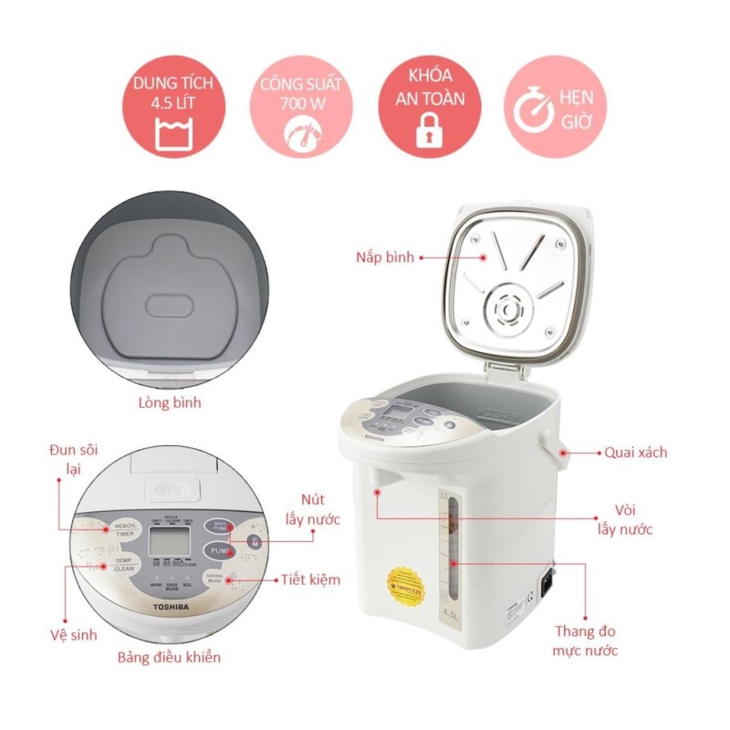 Nhằm đảm bảo sự an toàn sử dụng cho khách hàng, Tập Đoàn Toshiba đã tích hợp tính năng tự động ngắt điện khi xảy ra sự cố quá nhiệt, nước đã được đun sôi hoặc khi nước trong bình đun đã cạn sẽ hạn chế các sự cố đáng tiếc xảy ra, đồng thời giúp bảo vệ và duy trì tuổi thọ cho bình thủy điện tử. Ngoài ra, với chế độ khóa nước an toàn tự động sẽ tự động khóa chức năng rót nước sau 10 giây nếu bạn không rót nước nữa.
