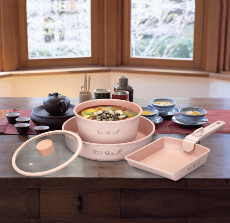 Được nhiều người tiêu dùng yêu mến và lựa chọn, thương hiệu Tiger Queen đến từ Hàn Quốc chuyên sản xuất các sản phẩm nhà bếp, gia dụng nói chung và Bộ nồi nhà bếp Tiger Queen nói riêng là một sự lựa chọn lí tưởng giúp bạn chế biến và thưởng thức các món ăn yêu thích cho gia đình mà vẫn giữ nguyên hương vị cũng như an toàn cho sức khỏe. Bộ nồi Ceramic Tiger Queen DCWCP-SET được làm bằng 3 lớp kim loại phủ 2 lớp gốm Ceramic dầy 1.8mm chống dính và 5 lớp đáy dày 3.5mm với công nghệ tráng men hiện đại nhất “Hard Anodized” không tróc men, chống gỉ sét, chống ăn mòn, độ bền cao với thiết kế sang trọng, an toàn và màu sắc trẻ trung luôn luôn có mặt trong mọi không gian nhà bếp.