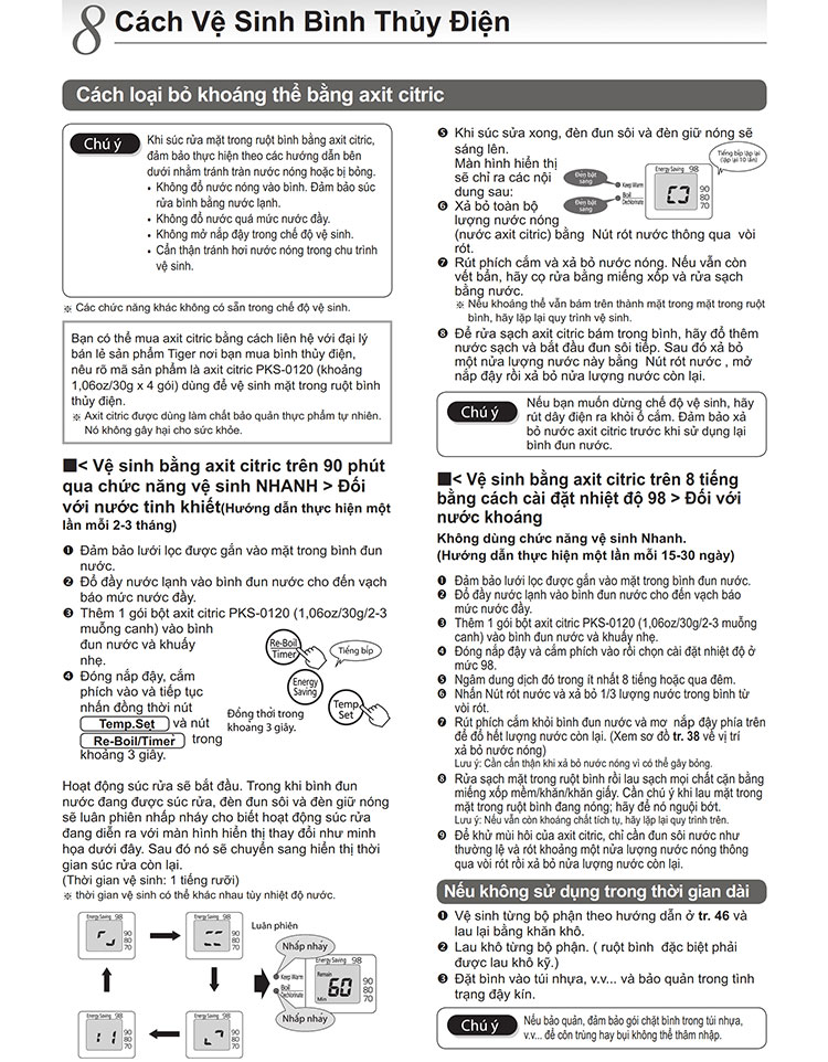 * Nếu bạn đang sử dụng bình thủy điện Tiger có chức năng làm sạch bằng Acid Citric, hãy làm theo hướng dẫn sử dụng để làm sạch.