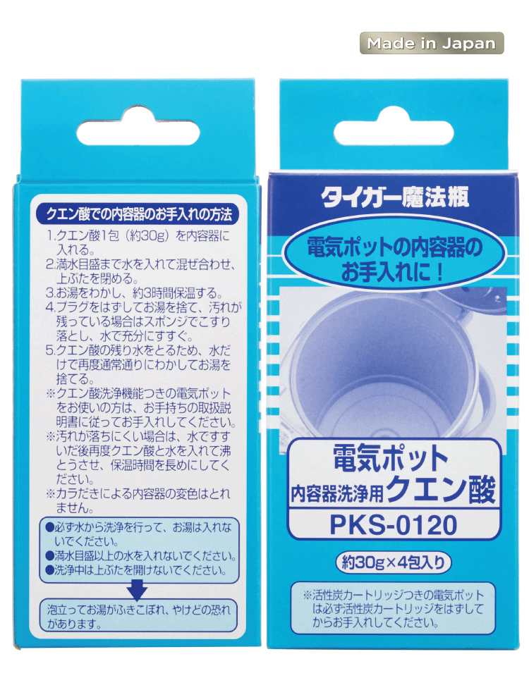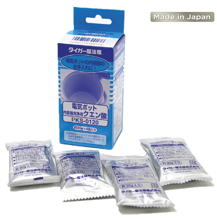Nhằm hỗ trợ các khách hàng dễ dàng và thuận tiện vệ sinh lồng trong bình thủy điện và bình đun siêu tốc hiệu Tiger thì Tập đoàn Tiger đến từ Nhật Bản đã sản xuất “Bột vệ sinh Acid Citric chuyên dụng PKS-0120” được sản xuất tại Nhật Bản dễ dàng làm sạch lồng trong của bình thủy điện và bình đun siêu tốc hiệu Tiger cũng như kéo dài tuổi thọ lồng trong của sản phẩm.