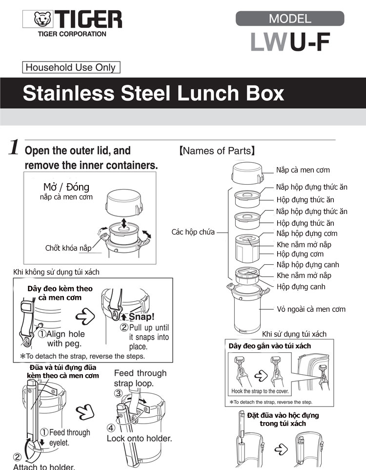 Được nhiều người tiêu dùng yêu mến và lựa chọn, Tập Đoàn Tiger chuyên sản xuất các sản phẩm nhà bếp, gia dụng nói chung và Cà men cơm giữ nhiệt Tiger nói riêng là một sự lựa chọn lí tưởng giúp bạn thưởng thức các món ăn yêu thích của mình mọi lúc mọi nơi và hợp vệ sinh mà vẫn giữ nguyên hương vị chuẩn cơm mẹ nấu. Cà men cơm giữ nhiệt Tiger 4 ngăn LWU-F200 được làm bằng chất liệu thép cao cấp không gỉ được thiết kế theo hình trụ đứng kết hợp với nhiều màu sắc trẻ trung luôn luôn là có mặt trong túi xách, ba lô của mọi người vào những giờ ăn trưa. Với kiểu dáng gọn nhẹ, tiện lợi có kèm theo túi xách, dây đeo và đũa sẽ là người bạn đồng hành cùng với bạn trong những hoạt động thường nhật như ăn trưa văn phòng, tự tay chuẩn bị bữa ăn cho người mà bạn yêu thương…. hay trong những chuyến dã ngoại và cực kỳ thuận tiện cho những gia đình có trẻ nhỏ.