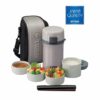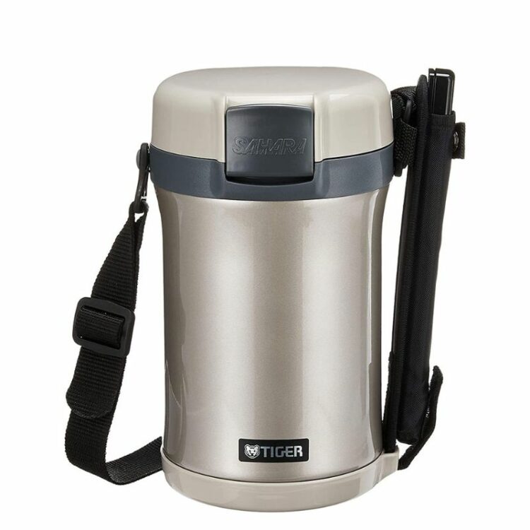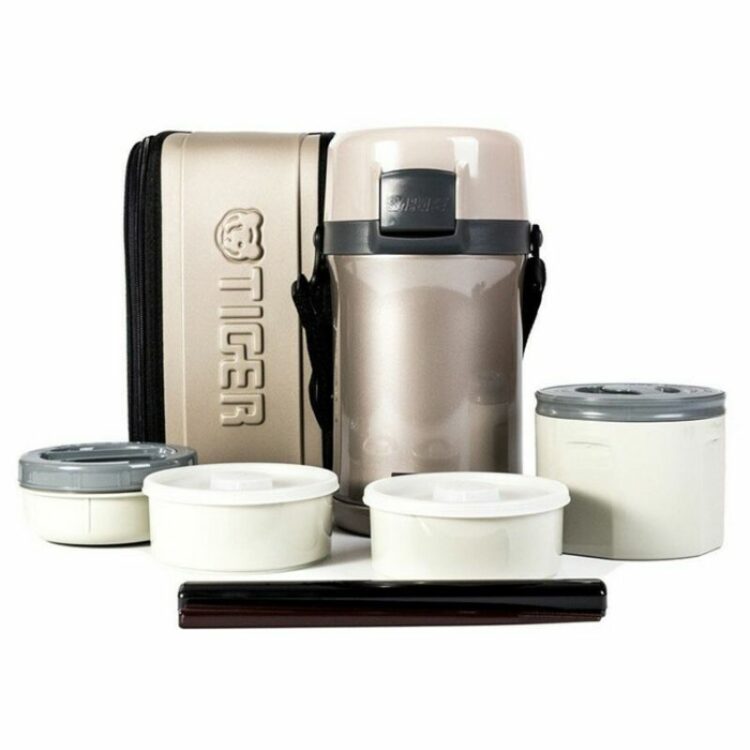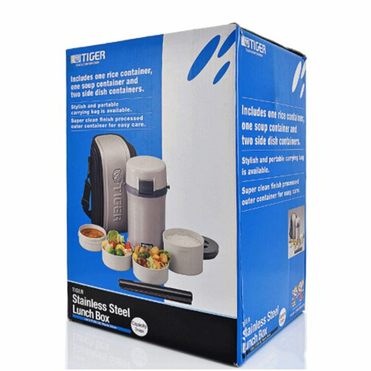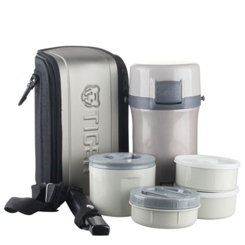Cà men cơm giữ nhiệt hiệu Tiger 4 ngăn (hộp chứa cơm được 3 chén cơm [0,61L], 2 hộp chứa thức ăn [0,3L], hộp chứa canh [0,27L]), vỏ ngoài của cà men được thiết kế chân không cách nhiệt giúp giữ ấm cơm và thức ăn còn nóng trong thời gian dài, công nghệ “Super Clean Plus” chống bám bẩn và khử mùi, kiểu dáng sang trọng, gọn nhẹ, tiện lợi, trong những hoạt động thường nhật hay trong những chuyến dã ngoại, có khóa nắp, các hộp chứa dùng được trong lò vi ba để hâm nóng, có túi xách, dây đeo và đũa kèm theo, màu bạc viền xám.