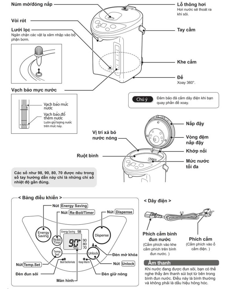 Bình thủy điện tử hiệu Tiger lồng tráng men khử mùi chống bám bẩn, đế xoay 360º, nắp tháo rời được, màn hình LCD, 4 chế độ cài đặt nhiệt độ giữ ấm “98ºC, 90ºC, 80ºC & 70ºC”, tích hợp chức năng nấu tiết kiệm điện, có chức năng hẹn giờ tiết kiệm điện, có chế độ khóa nước an toàn tự động, có chế độ nấu sôi lại và nấu khử mùi clo/vệ sinh, chế độ ngắt điện an toàn tự động khi bình cạn nước, màu cà phê sữa.