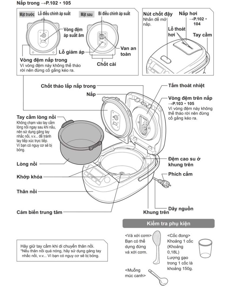 Nồi cơm điện tử cao tần áp suất hiệu Tiger 5 trong 1 với 20 chế độ nấu và chế độ tự vệ sinh nồi “Self Clean“, lồng 3 lớp kim loại được phủ 3 lớp men gốm “Cordierite Ceramic” chống dính bằng tia hồng ngoại dầy 1.7mm, công nghệ từ tính (IH) và áp suất tự động 1.25ATM ở nhiệt độ 106ºC giúp hạt cơm ngọt hơn, thơm ngon hơn, dẻo hơn & tiết kiệm điện cùng với thiết kế 3 vòng nhiệt giúp cơm chín nhanh hơn mà hạt cơm không bị nát và không bị khô trong quá trình giữ ấm cơm, với công nghệ nấu cơm siêu tốc “Exp. Limited Cups” mới nhất được tích hợp để nấu chín 1 – 3 cốc gạo (2 – 6 chén cơm) trong vòng 17 – 26 phút khi bạn cần nấu thêm cơm nhanh hay bạn chỉ nấu cho một khẩu phần ăn, chế độ giữ ấm cơm đến 24h, 2 chế độ hẹn giờ nấu, chế độ ngâm gạo, có chức năng khóa nắp an toàn và báo không có lồng nồi, chức năng khử mùi, màn hình LCD điều chỉnh thông minh, có quai xách, cốc đong gạo, muỗng xới cơm tự đứng, muỗng múc cháo kèm theo sản phẩm, màu đen.
