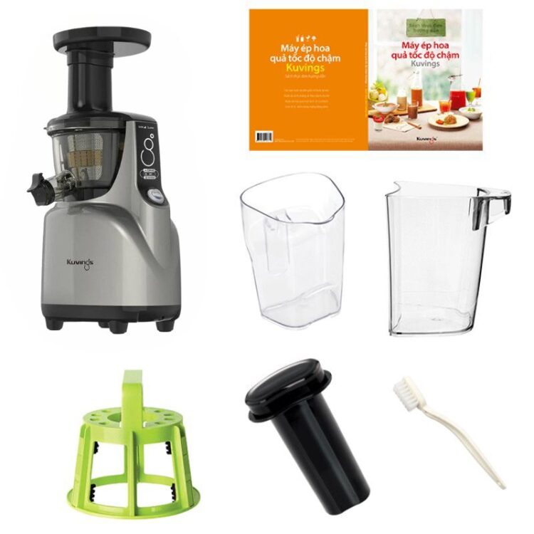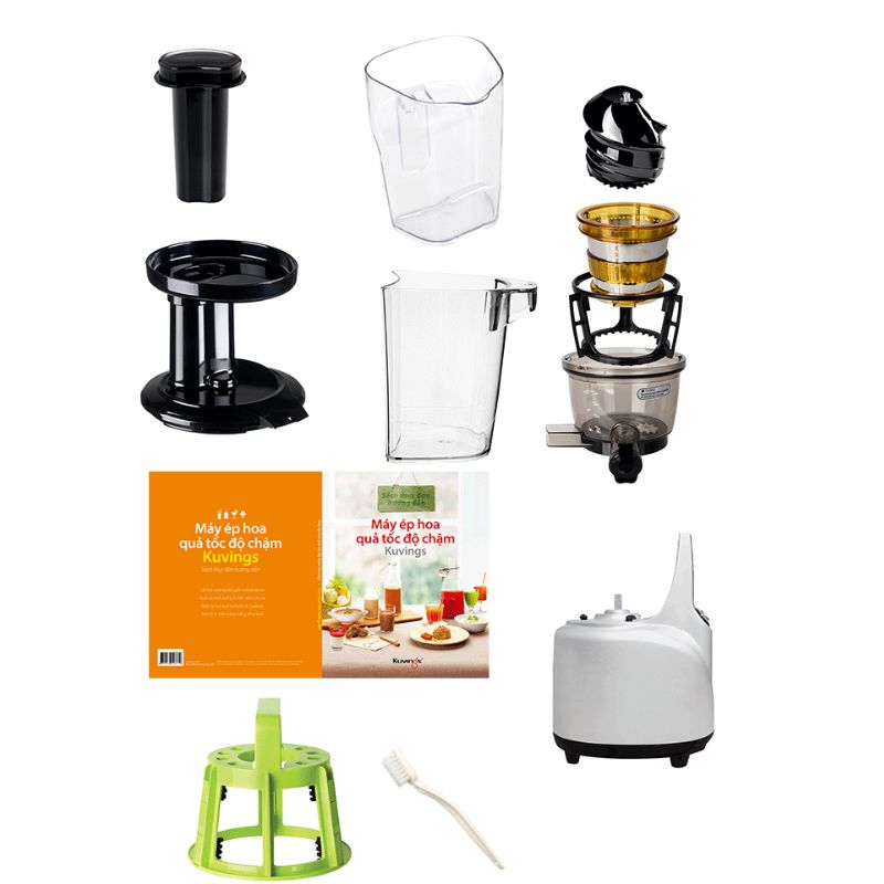 Có sách hướng dẫn công thức làm các loại Nước ép, Soup, Mojito, Cocktails, Sinh tố và Kem hoa quả, dụng cụ vệ sinh (chổi xoay và bàn chải), ca đựng nước ép và ca đựng bã ép kèm theo sản phẩm