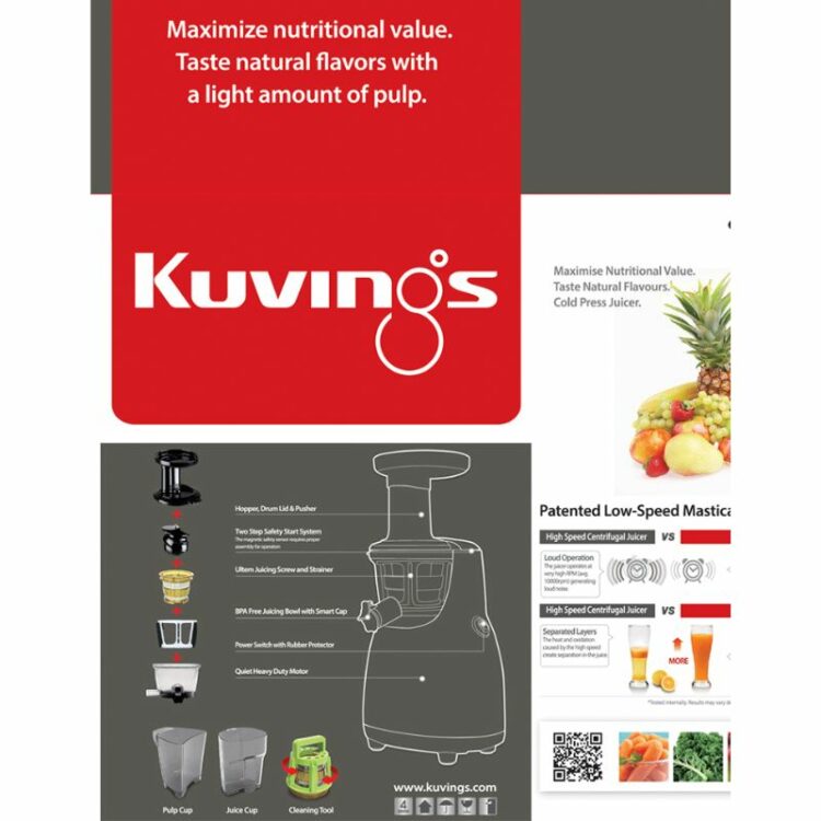 Nhằm đáp ứng nhu cầu cải thiện sức khỏe, làn da từ trái cây và rau củ quả tươi từ thiên nhiên mà vẫn giữ được Vitamin, Enzym, hương vị và màu sắc tự nhiên của trái cây và rau củ quả tươi thì Thương Hiệu Kuvings đến từ Hàn Quốc chuyên sản xuất các sản phẩm nhà bếp, gia dụng nói chung đã cho ra đời những mẫu máy ép chậm hiệu Kuvings cao cấp với công nghệ ép tốc độ chậm “Cold Pressed Juicing” mới nhất cho thị trường Việt Nam dựa trên nguyên tắc ép trái cây và rau củ quả trong môi trường ít không khí với dao ép không sinh nhiệt và tốc độ ép cực chậm bằng lực cưỡng bức cho ra lượng nước ép nguyên chất tươi nhiều gấp 1.5 lần và thơm ngon mà không bị tách nước nhanh. Máy ép chậm hiệu Kuvings NS-120CBM2 dung tích 400ml được sản xuất từ linh kiện cao cấp có độ bền cao và nhựa không chứa chất độc hại, thiết kế nhỏ gọn, nhiều màu sắc trẻ trung, sang trọng, hiện đại và an toàn luôn luôn có mặt trong mọi không gian nhà bếp.