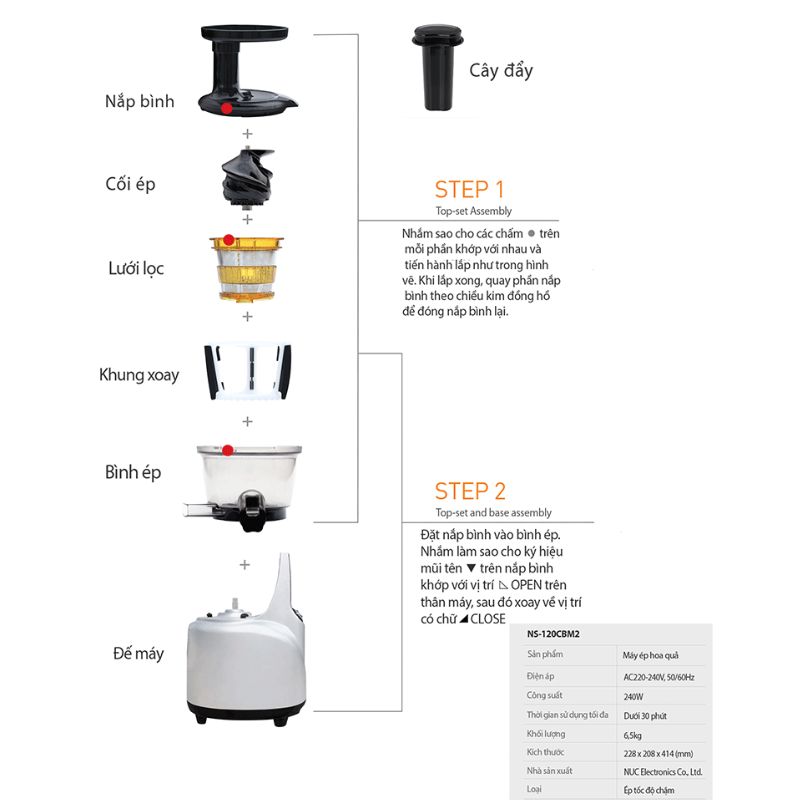Máy ép chậm hiệu Kuvings NS-120CBM2 dung tích 400ml nhập khẩu từ Hàn Quốc có thiết kế nhỏ gọn, nhiều màu sắc trẻ trung, sang trọng, hiện đại và an toàn luôn luôn có mặt trong mọi không gian nhà bếp. Bên cạnh đó, với cấu tạo từ linh kiện cao cấp và nhựa thân thiện môi trường, cứng cáp, bền bỉ và chịu nhiệt tốt giữ máy ép trái cây tốc độ chậm lâu phai màu, không mau dơ với độ bền cao theo thời gian sử dụng. Ngoài ra, máy ép trái cây tốc độ chậm Kuvings có sách hướng dẫn công thức làm các loại Nước ép, Soup, Mojito, Cocktails, Sinh tố và Kem hoa quả, dụng cụ vệ sinh (chổi xoay và bàn chải), ca đựng nước ép và ca đựng bã ép kèm theo sản phẩm tiện lợi phục vụ những ly nước ép với hương vị phong phú hơn, màu sắc tươi hơn và giữ được toàn bộ dinh dưỡng của trái cây và rau củ quả mà không bị tách nước nhanh cho gia đình bạn.