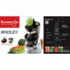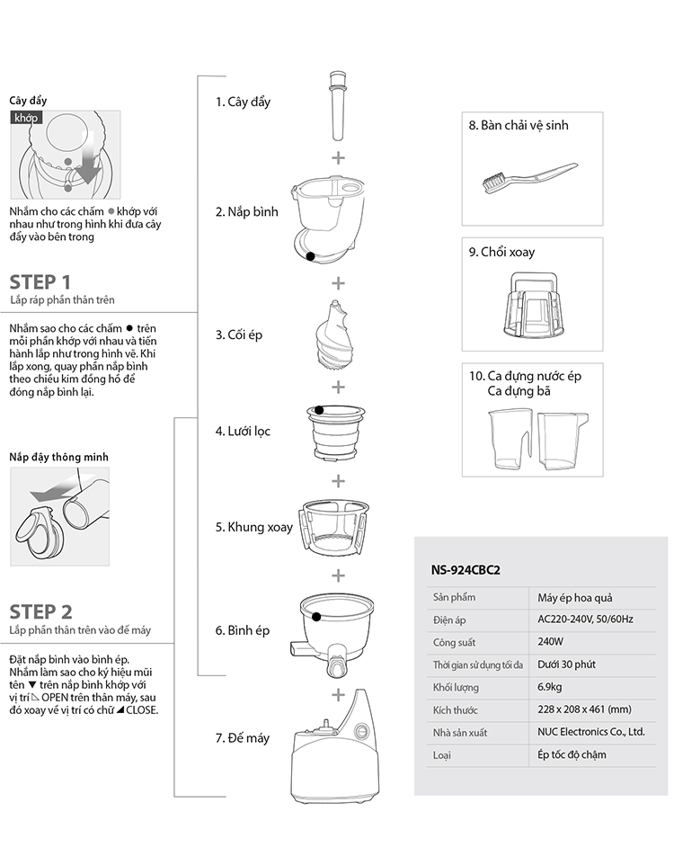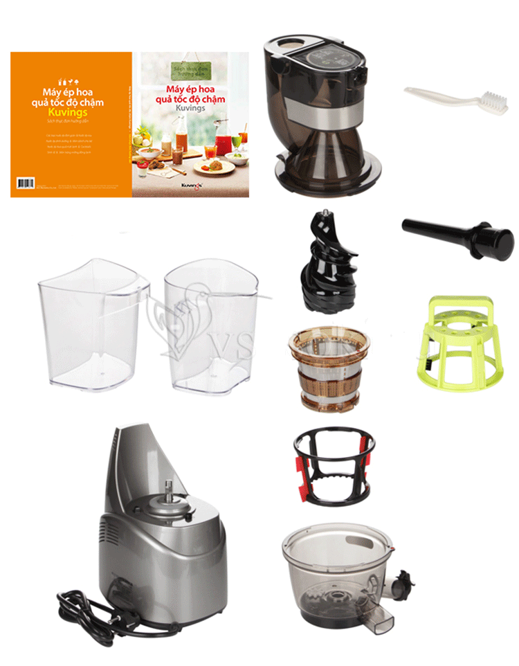 - Có sách hướng dẫn công thức làm các loại Nước ép, Soup, Mojito, Cocktails, Sinh tố và Kem hoa quả, dụng cụ vệ sinh (chổi xoay và bàn chải), ca đựng nước ép và ca đựng bã ép kèm theo sản phẩm.