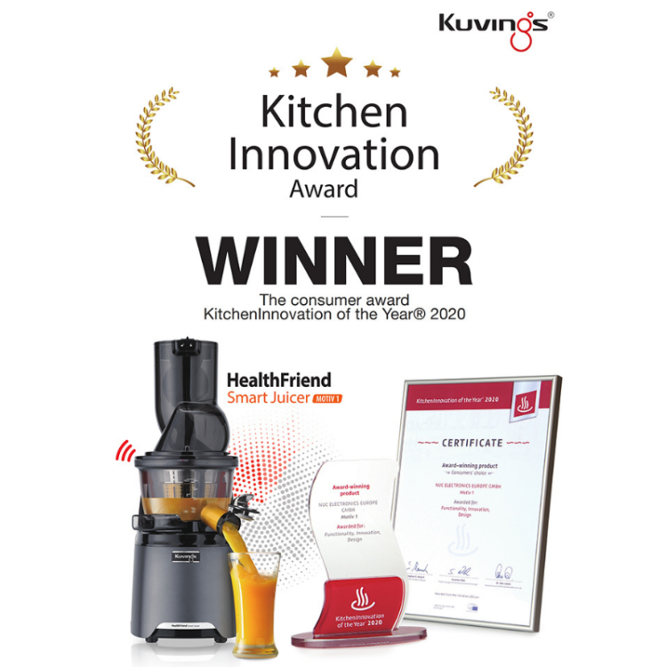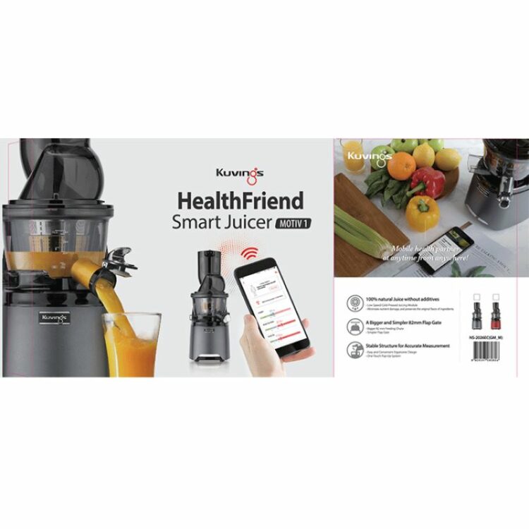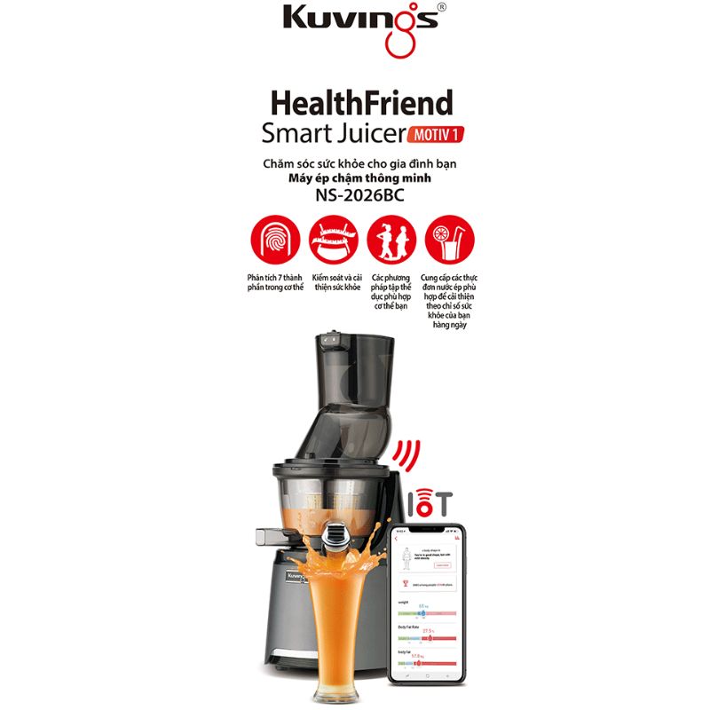 - Hỗ trợ “Health Care” : Phân tích 7 thành phần trong cơ thể bằng dụng cụ đo trở kháng sinh học (BIA) và kiểm soát, cải thiện sức khỏe qua phần mềm hỗ trợ Kuvings Smart Juicer.