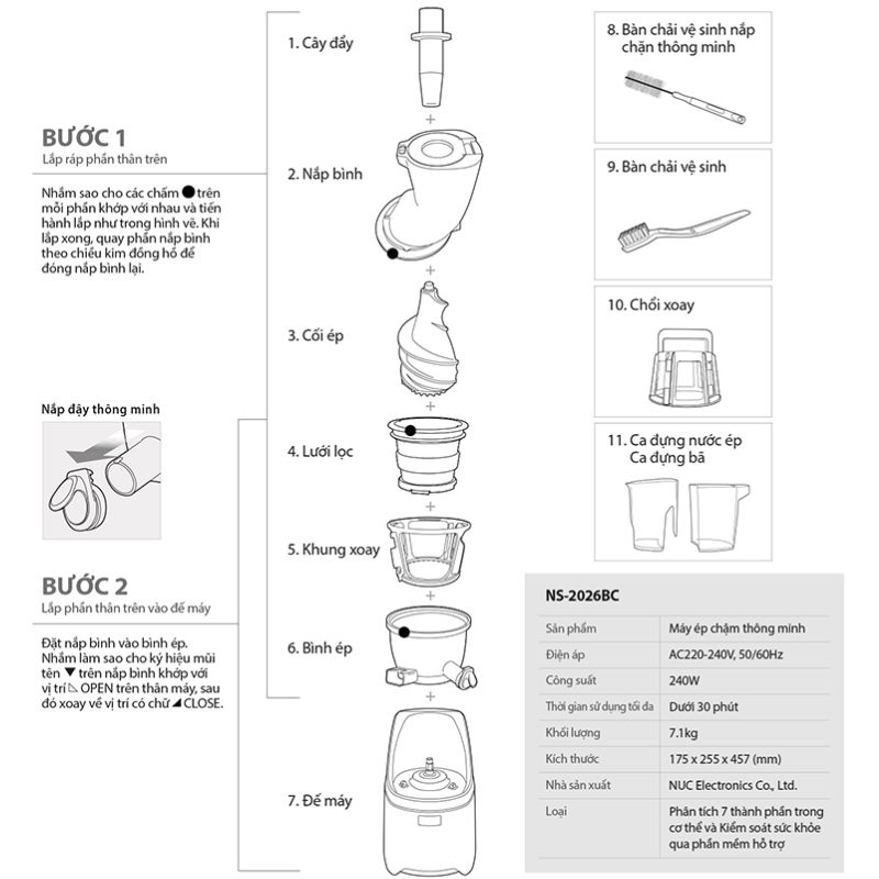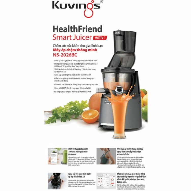 Nhằm đáp ứng nhu cầu kiểm soát và cải thiện sức khỏe, làn da từ trái cây và rau củ quả tươi từ thiên nhiên sao cho phù hợp với từng cơ thể mỗi người mà vẫn giữ được Vitamin, Enzym, hương vị và màu sắc tự nhiên của trái cây và rau củ quả tươi thì Thương Hiệu Kuvings đến từ Hàn Quốc chuyên sản xuất các sản phẩm nhà bếp, gia dụng nói chung đã cho ra đời những mẫu máy ép trái cây tốc độ chậm thông minh hiệu Kuvings cao cấp với công nghệ ép tốc độ chậm “Cold Pressed Juicing” mới nhất cho thị trường Việt Nam dựa trên nguyên tắc ép trái cây và rau củ quả trong môi trường ít không khí với dao ép không sinh nhiệt và tốc độ ép cực chậm bằng lực cưỡng bức cho ra lượng nước ép nguyên chất tươi nhiều gấp 1.5 lần và thơm ngon mà không bị tách nước nhanh cùng với tính năng dẫn đầu mới nhất “Health Care” phân tích 7 thành phần trong cơ thể bằng dụng cụ đo trở kháng sinh học (BIA) và kiểm soát, cải thiện sức khỏe qua phần mềm hỗ trợ Kuvings Smart Juicer. Máy ép chậm thông minh hiệu Kuvings NS-2026BC dung tích 400ml được sản xuất từ linh kiện cao cấp có độ bền cao và nhựa không chứa chất độc hại, thiết kế nhỏ gọn, nhiều màu sắc trẻ trung, sang trọng, hiện đại và an toàn luôn luôn có mặt trong mọi không gian mỗi Gia đình, Phòng tập gym, Trung tâm Spa, Thẩm mỹ viện, Quán nước ép dinh dưỡng và Nhà hàng.