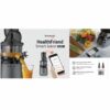 - Có sách hướng dẫn công thức làm các loại Nước ép, Soup, Mojito, Cocktails, Sinh tố và Kem hoa quả, dụng cụ vệ sinh (chổi xoay và 2 bàn chải), ca đựng nước ép và ca đựng bã ép kèm theo sản phẩm.