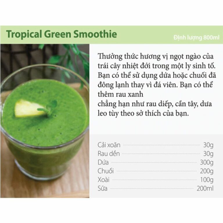 Nguyên liệu: 200ml sữa + 30gr cải xoăn + 30gr rau dền + 300gr dứa đã gọt vỏ và cắt khúc + 200gr chuối đã lột vỏ và cắt khúc + 100gr xoài đã lột vỏ và cắt khúc + 10 viên đá bi nhỏ. Cách làm như sau: