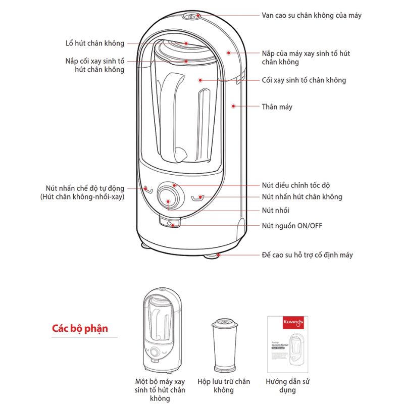 - Có hộp lưu trữ chân không, sách hướng dẫn công thức làm các loại sinh tố và một van chân không thay thế tặng thêm theo sản phẩm