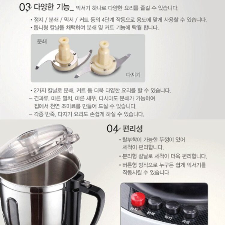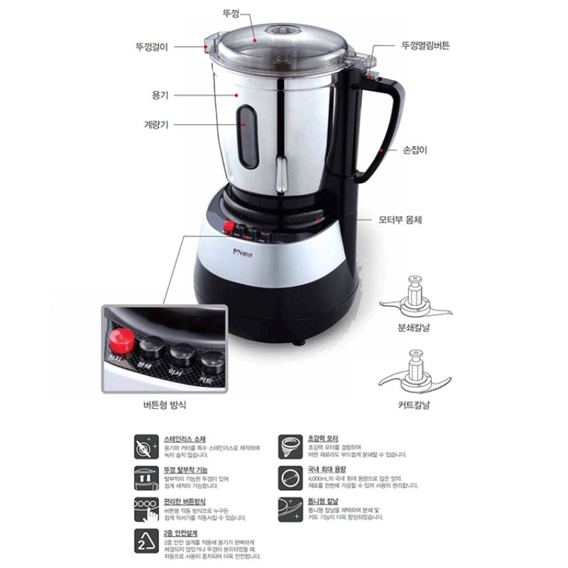 Máy xay sinh tố hiệu PoongNyun (PN) SMKANB-4000 với lưỡi dao xay/nghiền/trộn, lưỡi dao băm nhỏ thức ăn & các loại hạt và cối xay sinh tố cấu tạo từ thép cao cấp không gỉ chống ăn mòn, chống bám bẩn cho ra các món ăn an toàn và hợp vệ sinh. Với thiết kế bảng điều khiển nút nhấn 2 tốc độ và nút nhồi đơn giản, dễ dàng sử dụng với chức năng : xay sinh tố, xay đá, nghiền thực phẩm, trộn, băm nhỏ thức ăn & các loại hạt đáp ứng những nhu cầu như làm sinh tố hay xay gia vị với số lượng lớn khi quán đông khách. Ngoài ra, thang đo quy định tối đa và tối thiểu tương ứng với công thức xay, nghiền, trộn, băm và thành phần nguyên liệu cho vào được khắc trong các cối xay giúp bạn dễ dàng, thuận tiện đo lường nguyên liệu khi xay, nghiền, trộn, băm.