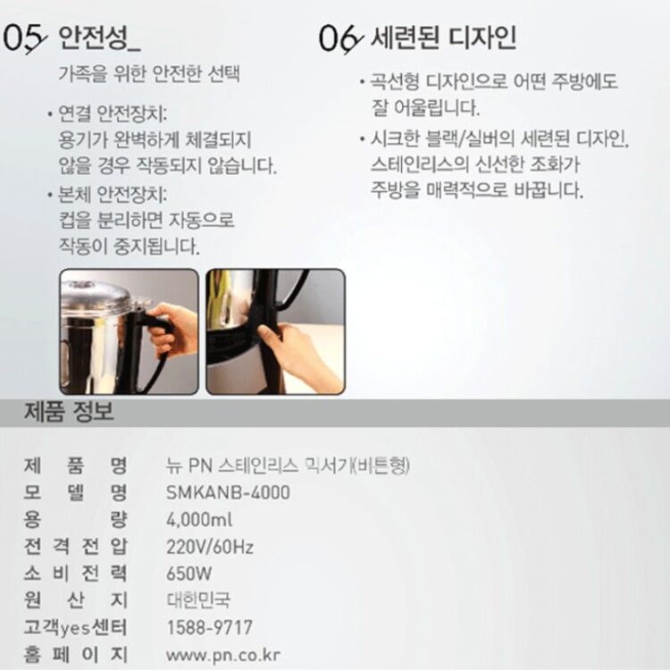 Máy xay sinh tố dành cho kinh doanh hiệu PoongNyun (PN) SMKANB-4000 dung tích 4.0 lít nhập khẩu từ Hàn Quốc có thiết kế theo phong cách Châu Âu nhỏ gọn, nhiều màu sắc trẻ trung, sang trọng, hiện đại và an toàn luôn luôn là sự lựa chọn để kinh doanh tại nhà hàng, quán bar, khách sạn và các quán chuyên nước sinh tố. Bên cạnh đó, với cấu tạo từ linh kiện cao cấp và nhựa thân thiện môi trường, cứng cáp, bền bỉ và chịu nhiệt tốt giữ máy xay sinh tố cầm tay lâu phai màu, không mau dơ với độ bền cao theo thời gian sử dụng. Ngoài ra, máy xay sinh tố PoongNyun (PN) có lưỡi dao xay/nghiền/trộn, lưỡi dao băm nhỏ thức ăn & các loại hạt, cây khuấy sinh tố và dụng cụ tháo lưỡi dao kèm theo sản phẩm tiện lợi phục vụ những ly nước sinh tố hay làm gia vị với số lượng nhiều.