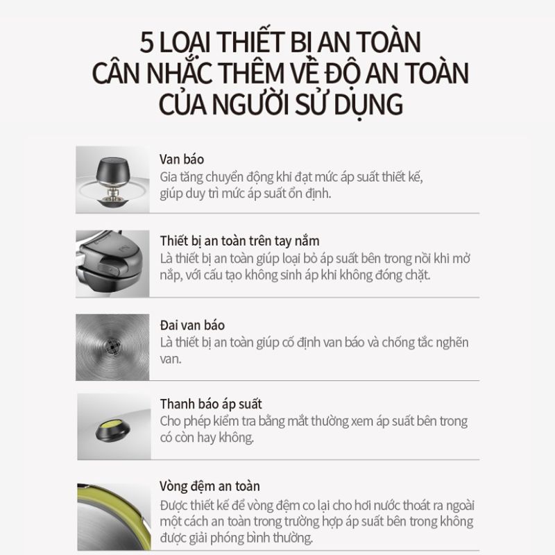 Nồi áp suất Inox IH POONGNYUN [PN] HNHPC-06(IH) với thiết kế 6 chế độ an toàn cho sản phẩm giúp bạn an tâm trong khi nấu : Khóa nắp an toàn (không tạo áp suất khi chưa đóng nắp đúng cách), Van an toàn (tự động xả hơi nếu áp suất trong nồi vượt mức cho phép do bị nghẹt bọt thức ăn ở lần nấu trước đó cũng như cảnh báo áp suất còn trong nồi hay không), Nút tín hiệu (cảnh báo áp suất còn trong nồi hay không), Nắp bảo vệ van an toàn và nút tín hiệu (ngăn không cho thức ăn làm nghẹt van), Ron (không tạo áp suất khi ron lắp không đúng cách), Van an toàn (cảnh báo cho khách hàng biết còn áp suất bên trong nồi).