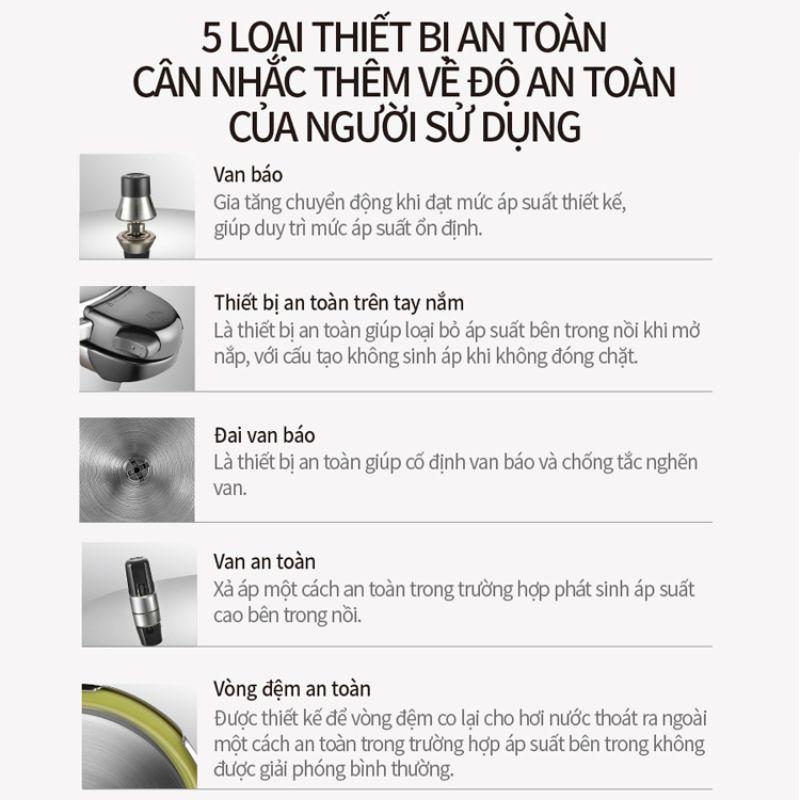 Nồi áp suất Inox IH POONGNYUN [PN] HNVPC-06(IH) với thiết kế 5 chế độ an toàn cho sản phẩm giúp bạn an tâm trong khi nấu : Khóa nắp an toàn (không tạo áp suất khi chưa đóng nắp đúng cách), Van an toàn (tự động xả hơi nếu áp suất trong nồi vượt mức cho phép do bị nghẹt bọt thức ăn ở lần nấu trước đó cũng như cảnh báo áp suất còn trong nồi hay không), Nút tín hiệu (cảnh báo áp suất còn trong nồi hay không), Nắp bảo vệ van an toàn và nút tín hiệu (ngăn không cho thức ăn làm nghẹt van), Ron (không tạo áp suất khi ron lắp không đúng cách).