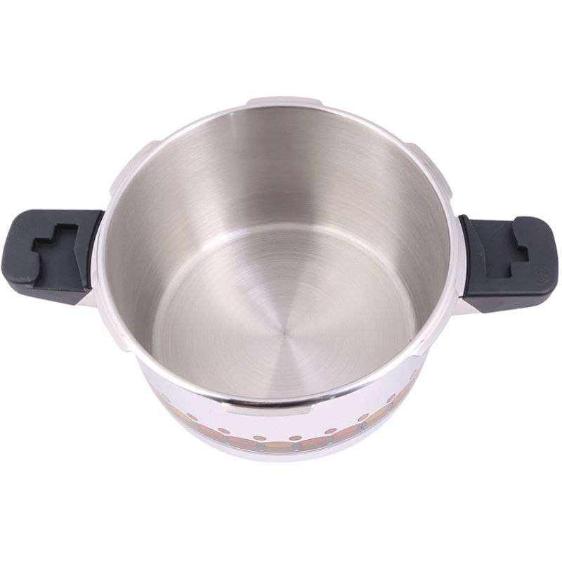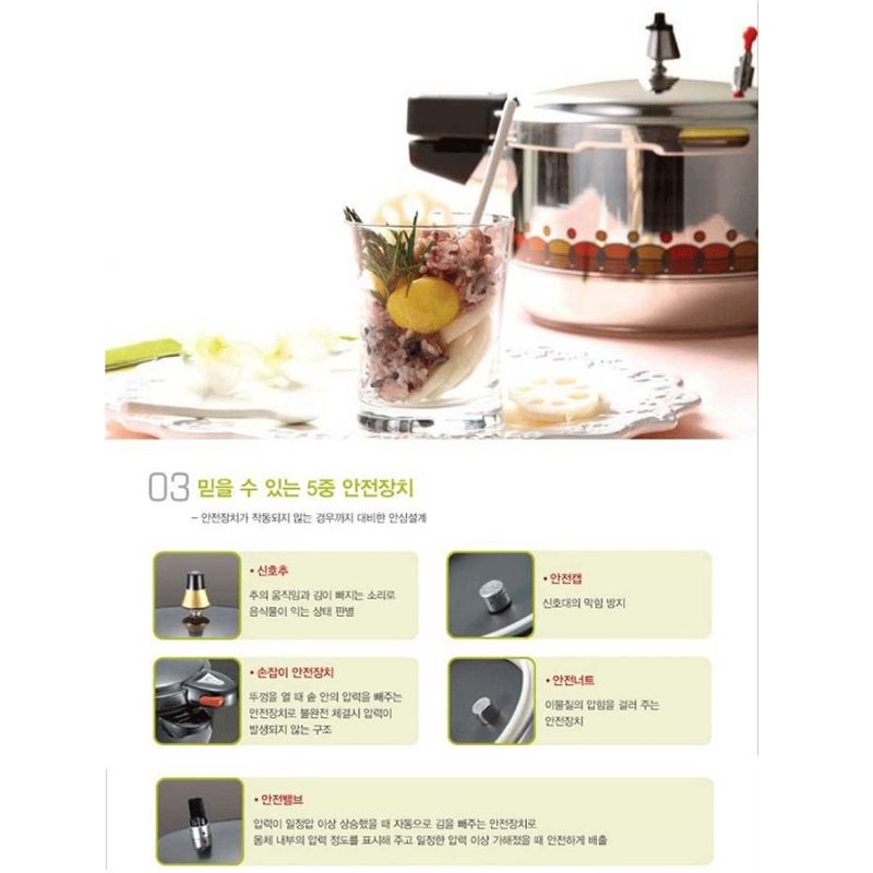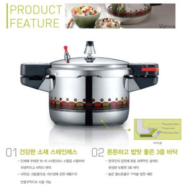 Nồi áp suất cao cấp Inox hiệu PoongNyun 3 lớp đáy dầy 3.6mm giữ và gia nhiệt nhanh hơn giúp thức ăn chín mềm cực nhanh, tiết kiệm thời gian và nhiên liệu với các món hầm, luộc, kho, hấp, nấu cháo, nấu cơm, nấu cơm trộn, nấu gạo lức…., dùng trên bếp gas, bếp điện và bếp hồng ngoại, tay cầm ngắn và chống nóng, chức năng khóa an toàn tự động 5 chế độ, có ghim Inox thông van xả kèm theo sản phẩm thuận tiện sử dụng cho gia đình, màu Inox hoa văn tay cầm đen.