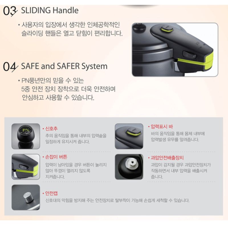 Được nhiều người tiêu dùng yêu mến và lựa chọn, Tập Đoàn POONGNYUN (PN) đến từ Hàn Quốc chuyên sản xuất các sản phẩm nhà bếp, gia dụng nói chung và Nồi áp suất POONGNYUN (PN) nói riêng là một sự lựa chọn lí tưởng giúp bạn chế biến và thưởng thức các món ăn yêu thích cho gia đình mà vẫn giữ nguyên hương vị cũng như an toàn cho sức khỏe đặc biệt là tiết kiệm thời gian cho các món kho và hầm. Nồi áp suất POONGNYUN (PN) BPNPC-10 được làm bằng chất liệu nhôm chống dính tinh khiết nguyên khối cao cấp với công nghệ tráng men hiện đại nhất “Hard Anodized” không tróc men, không ăn mòn, độ bền cao với thiết kế sang trọng, an toàn và nhiều màu sắc trẻ trung luôn luôn có mặt trong mọi không gian nhà bếp.