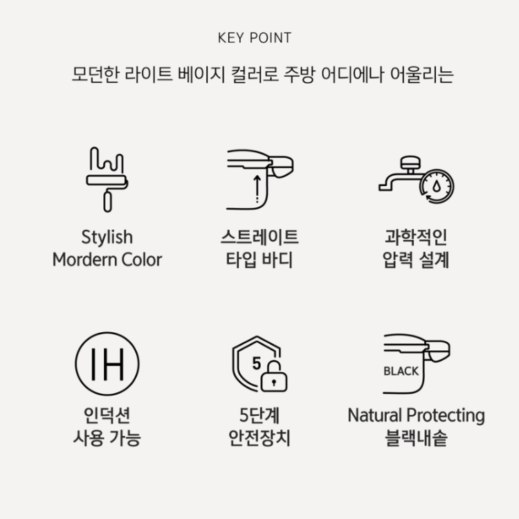 Nồi áp suất nhôm chống dính IH POONGNYUN BEDPC-06(IH) dung tích 3.5 lít nhập khẩu từ Hàn Quốc thu hút ánh nhìn với thiết kế theo phong cách Châu Âu hài hòa với cảm giác sang trọng, hiện đại và tinh tế tăng độ thẩm mỹ cho nhà bếp cũng như phù hợp với nhu cầu của người sử dụng tiện lợi cho việc chế biến các món ăn khác nhau cho gia đình như hầm, luộc, kho, hấp, nấu cháo, nấu cơm, nấu cơm trộn, nấu gạo lức… hay chế biến những món yêu cầu độ mềm, cần nấu trong thời gian ngắn [30 – 90 phút] như hầm xương, gân… Bên cạnh đó, với công nghệ tráng men hiện đại nhất “Hard Anodizing” không tróc sơn, chống gỉ sét, chống ăn mòn bên ngoài nồi giữ nồi áp suất lâu phai màu và không mau dơ.