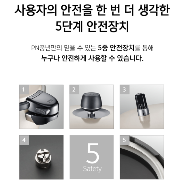 Nồi áp suất nhôm chống dính IH POONGNYUN BEDPC-06(IH) với thiết kế 5 chế độ an toàn cho sản phẩm giúp bạn an tâm trong khi nấu : Khóa nắp an toàn (không tạo áp suất khi chưa đóng nắp đúng cách), Van an toàn (tự động xả hơi nếu áp suất trong nồi vượt mức cho phép do bị nghẹt bọt thức ăn ở lần nấu trước đó cũng như cảnh báo áp suất còn trong nồi hay không), Nút tín hiệu (cảnh báo áp suất còn trong nồi hay không), Nắp bảo vệ van an toàn và nút tín hiệu (ngăn không cho thức ăn làm nghẹt van), Ron (không tạo áp suất khi ron lắp không đúng cách).