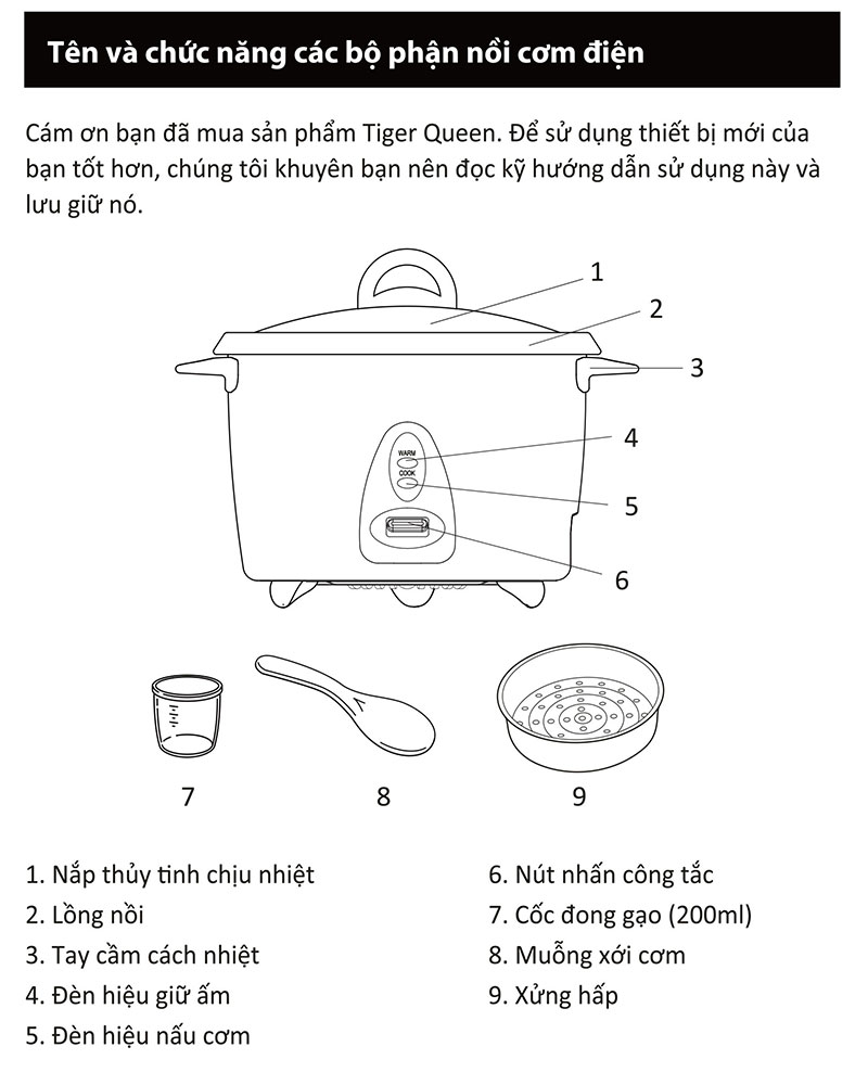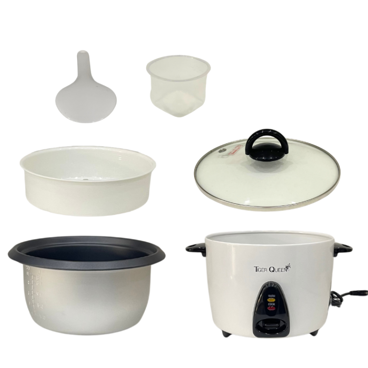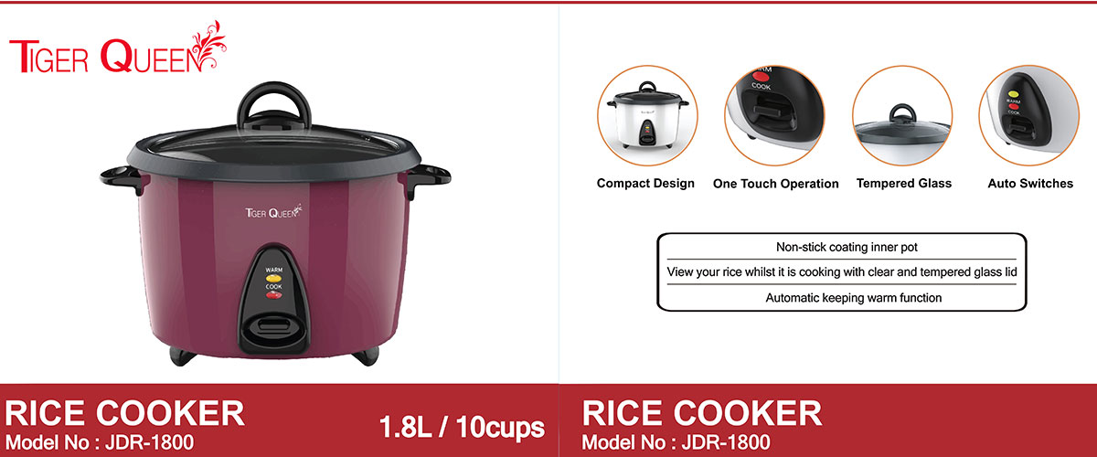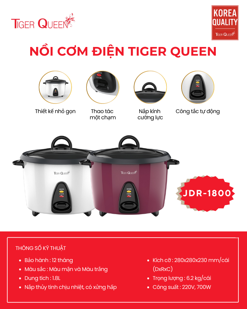 Nhằm đáp ứng nhu cầu nấu cơm thơm ngon, nhanh chóng, dễ dàng, an toàn và tiện lợi để phục vụ những bữa cơm đa dạng cho người nội trợ cũng như giữ được hương vị và độ ngọt của hạt cơm thì Thương hiệu Tiger Queen đến từ Hàn Quốc chuyên sản xuất các sản phẩm nhà bếp, gia dụng nói chung đã cho ra đời những mẫu nồi cơm điện hiệu Tiger Queen cao cấp cho thị trường Việt Nam dựa trên nguyên tắc cân bằng nhiệt, hơi nước và thời gian nấu. Nồi cơm điện nắp rời Tiger Queen 2 trong 1 JDR-1800 được sản xuất từ linh kiện cao cấp có độ bền cao và nhựa không chứa chất độc hại, thiết kế nhỏ gọn, sang trọng, hiện đại và an toàn luôn luôn có mặt trong mọi không gian nhà bếp.