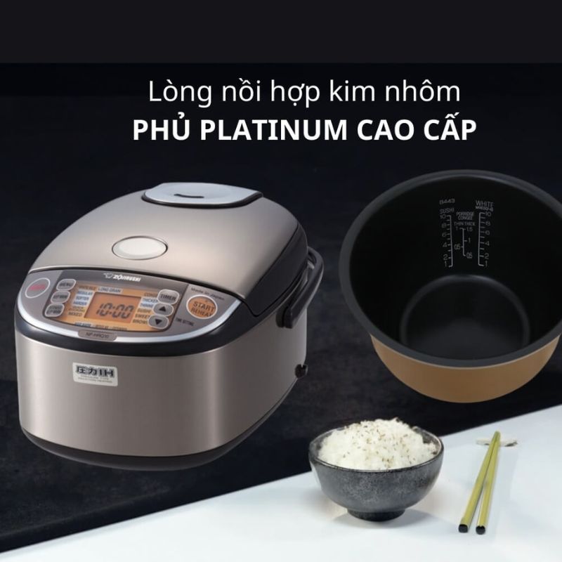 Nồi cơm điện tử cao tần áp suất Zojirushi NP-HRQ10 là sản phẩm không chứa chất gây ung thư “PFOA” với cấu trúc lồng nồi “Platinum” chống dính bằng tia hồng ngoại phủ hạt bạch kim tạo kềm dầy 1.7mm với độ bền gấp 5 lần sẽ tăng cường khả năng gia nhiệt nhanh hơn và giữ cơm nóng lâu hơn, không gây ra những chất độc hại cho sức khỏe, độ bền cao, hạn chế bám bẩn và dễ vệ sinh cũng như giữ cơm nóng lâu hơn.Không chỉ vậy, lớp phủ hạt bạch kim sẽ làm nước có tinh kềm giúp cơm ngon hơn 15% so với dòng NP-HTQ. Ngoài ra, với thiết kế nắp trong có ron kín hơi giữ cơm vẫn còn ấm trong vòng 5 giờ khi nhà bị mất điện và hạn chế cơm bị oi, thiu do vi khuẩn bên ngoài tác động.