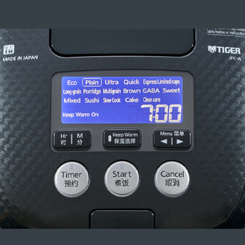 Nồi cơm điện tử cao tần áp suất kép Tiger JPC-W18W với thiết kế bảng điều khiển màn hình LCD điều chỉnh nút nhấn Menu thông minh “lùi và tới” mà không cần nhấn theo thứ tự tuần hoàn, hiện đại, đơn giản và dễ dàng sử dụng với 15 chức năng : 13 chức năng nấu cơm [ Nấu tiết kiệm điện, Nấu gạo trắng, Nấu cơm cực ngon, Nấu cơm nhanh, Nấu cơm siêu tốc, Nấu gạo hạt dài, Nấu cháo, Nấu gạo trộn ngũ cốc, Nấu gạo lức, Nấu gạo lức nảy mầm, Nấu gạo nếp, Nấu cơm trộn, Nấu gạo sushi ], hầm, làm bánh và giữ ấm đáp ứng những bữa cơm đa dạng cho gia đình bạn. Không chỉ vậy, chế độ giữ ấm cơm tự động lên đến 24 giờ mà cơm không bị khô rất tiện lợi và tiết kiệm chi phí cho người nội trợ không có nhiều thời gian nấu cơm.