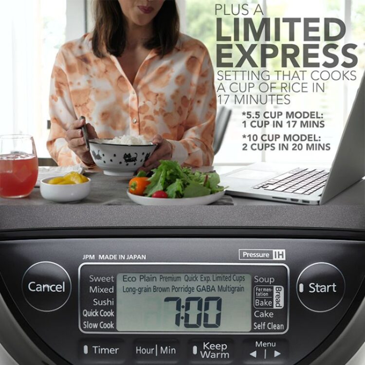 Nồi cơm điện tử cao tần Tiger JPM-H18V với chức năng nấu cơm siêu tốc “Exp. Limited Cups” công nghệ mới chỉ được tích hợp trên những nồi cơm điện tử cao cấp nấu chín 1 – 3 cốc gạo (2 – 6 chén cơm) trong vòng 17 – 26 phút khi bạn cần nấu thêm cơm nhanh khi thiếu cơm cho khẩu phần ăn hay bạn chỉ nấu cho một khẩu phần ăn giúp bạn tiết kiệm nhiều thời gian cho công việc nội trợ. Lưu ý : khi nấu cơm ở chế độ nấu cơm siêu tốc, cơm chín sẽ hơi cứng. (Bạn có thể điều chỉnh thời gian hấp để cơm mềm hơn theo sách hướng dẫn sử dụng tại trang 115).