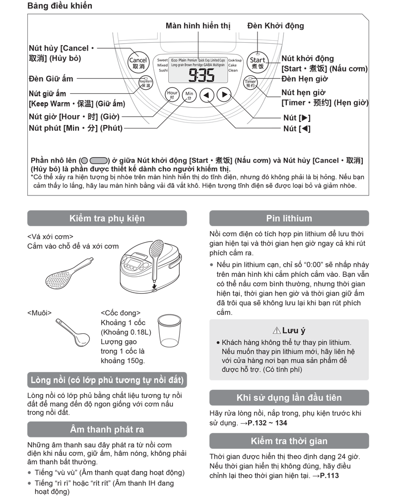Chế độ hẹn giờ : Sử dụng được ở chức năng nấu tiết kiệm điện, nấu gạo trắng, nấu gạo Sushi, nấu gạo trộn ngũ cốc, nấu gạo lức, nấu cháo, nấu gạo hạt dài, nấu cháo gạo lức, nấu gạo lức nảy mầm