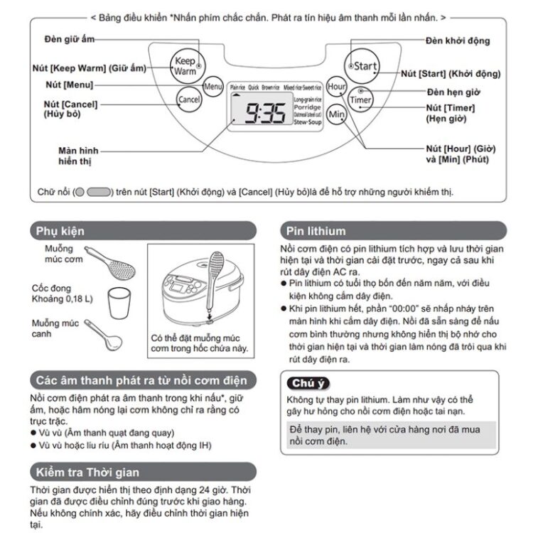 Có cốc đong gạo, muỗng xới cơm (chịu nhiệt lên đến 120ºC), muỗng múc cháo/soup (chịu nhiệt lên đến 120ºC) kèm theo sản phẩm