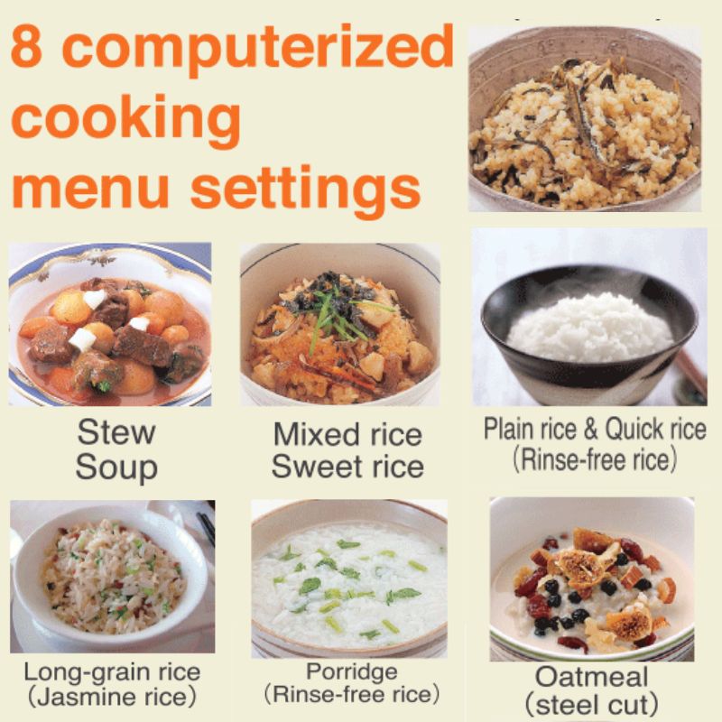 8 chức năng : 7 chức năng nấu cơm (nấu gạo trắng, nấu cơm nhanh, nấu gạo lức, nấu gạo nếp – nấu cơm trộn, nấu gạo hạt dài, nấu cháo, nấu cháo bột yến mạch), hầm – nấu soup và giữ ấm