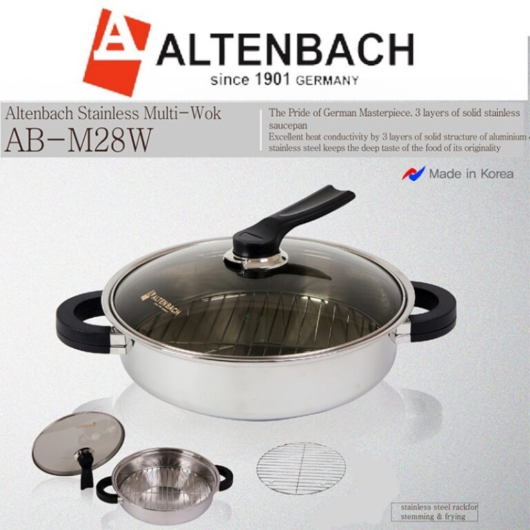 Được nhiều người tiêu dùng yêu mến và lựa chọn, Tập Đoàn ALTENBACH đến từ Đức chuyên sản xuất các sản phẩm nhà bếp, gia dụng nói chung và Chảo Inox Altenbach nói riêng là một sự lựa chọn lí tưởng giúp bạn chế biến và thưởng thức các món ăn yêu thích cho gia đình mà vẫn giữ nguyên hương vị cũng như an toàn cho sức khỏe. Với bề mặt chảo được thiết kế kiểu tổ ong độc quyền của Altenbach làm thức ăn mau chín, Chảo Inox đa năng 2 in 1 Altenbach AB-M28W được làm bằng chất liệu thép cao cấp SUS316 từ nhà sản xuất thép uy tín “POSCO” không gỉ sét, độ bền cao với thiết kế sang trọng, hiện đại và an toàn luôn luôn có mặt trong mọi không gian nhà bếp.