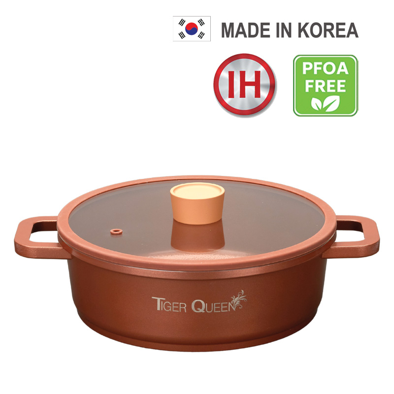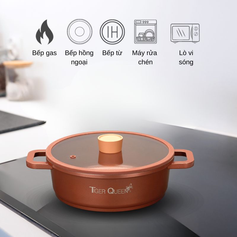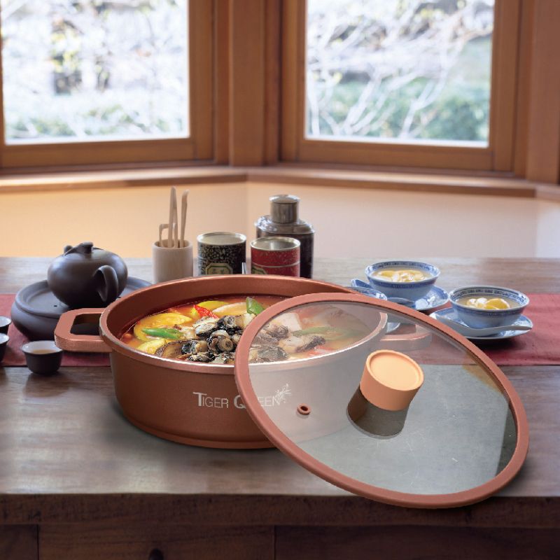 Được nhiều người tiêu dùng yêu mến và lựa chọn, thương hiệu Tiger Queen đến từ Hàn Quốc chuyên sản xuất các sản phẩm nhà bếp, gia dụng nói chung và Nồi lẩu nhà bếp Tiger Queen nói riêng là một sự lựa chọn lí tưởng giúp bạn chế biến và thưởng thức các món ăn yêu thích cho gia đình mà vẫn giữ nguyên hương vị cũng như an toàn cho sức khỏe. Nồi lẩu nhà bếp Ceramic Tiger Queen CWCB-24CL được làm bằng 3 lớp kim loại phủ 2 lớp gốm Ceramic dầy 2.5mm chống dính và 9 lớp đáy dày 4.0mm với công nghệ tráng men hiện đại nhất “Hard Anodized” không tróc men, chống gỉ sét, chống ăn mòn, độ bền cao với thiết kế sang trọng, an toàn và màu sắc trẻ trung luôn luôn có mặt trong mọi không gian nhà bếp.